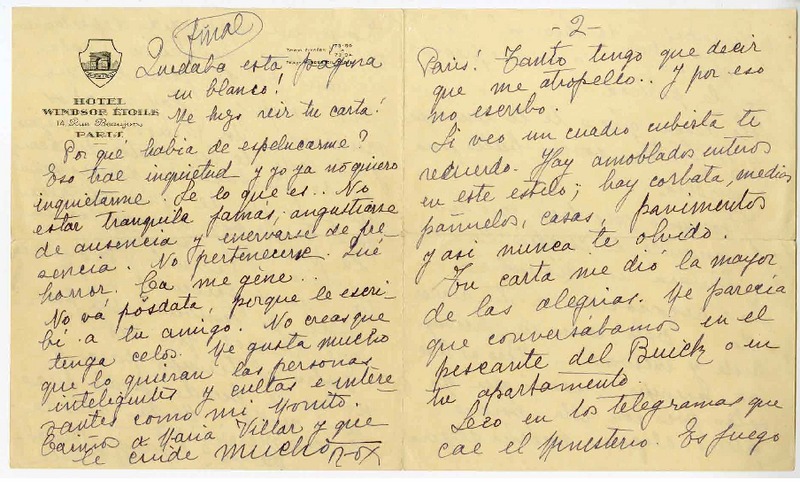 [Carta] 1926, París, Francia [a una amiga "Monito"] [manuscrito] Elvira Santa Cruz Ossa (Roxane).