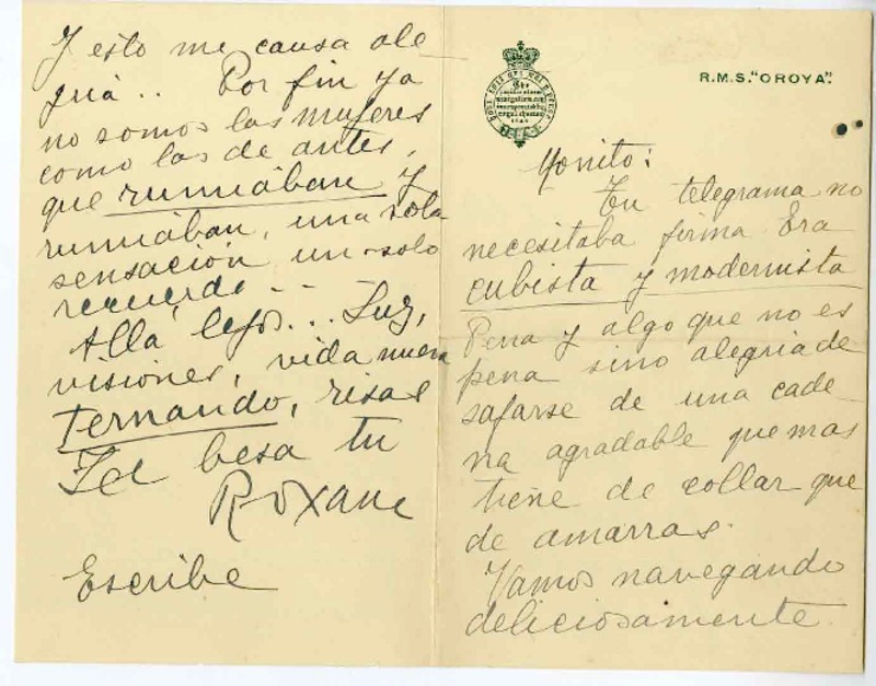 [Carta] 1926 septiembre 5, A bordo del "Oroya" en el mar Atlántico [ una amiga "Monito"] [manuscrito] Elvira Santa Cruz Ossa (Roxane).