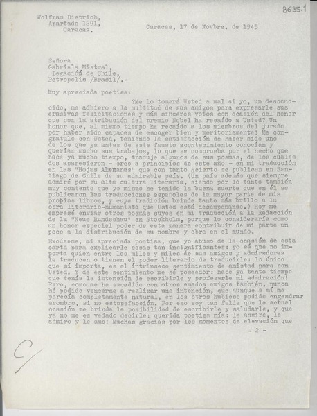 [Carta] 1945 nov. 17, Caracas [a] Gabriela Mistral, Petrópolis, Brasil [manuscrito] Wolfram Dietrich.