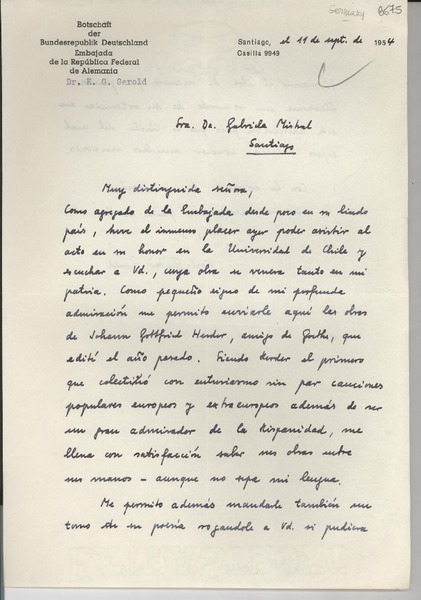 [Carta] 1954 sept. 11, Santiago [a] Gabriela Mistral, Santiago [manuscrito] Karl-Gustav Gerold