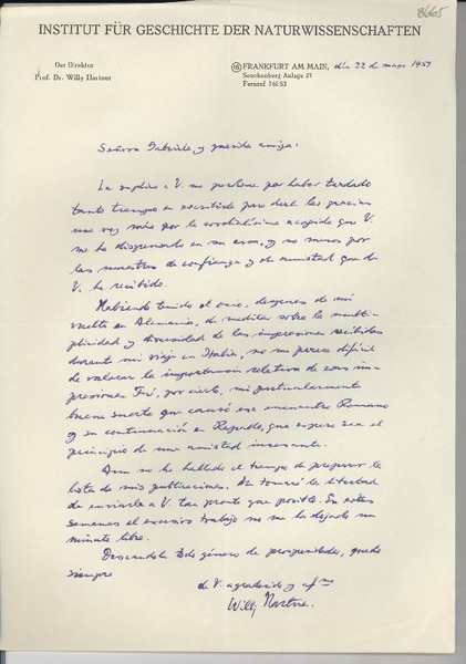 [Carta] 1951 mayo 22, Frankfurt, [Alemania] [a] Gabriela [Mistral] [manuscrito] Willy Hartner.