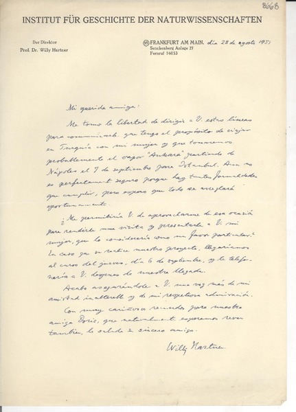 [Carta] 1951 ago. 28, [Frankfurt, Alemania] [a] [Gabriela Mistral] [manuscrito] Willy Hartner.