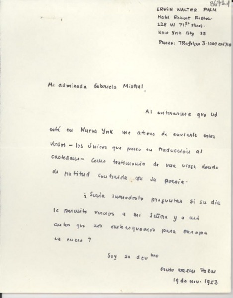 [Carta] 1953 nov. 19, New York, [EE.UU.] [a] Gabriela Mistral [manuscrito] Erwin Walter Palm.