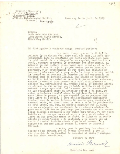 [Carta] 1949 jun. 24, Caracas [a] Gabriela Mistral, Monrovia, California [manuscrito] Mauricio Boersner.