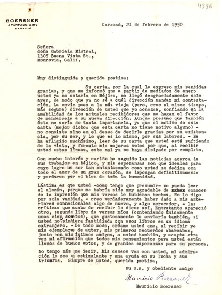 [Carta] 1950 feb. 21, Caracas [a] Gabriela Mistral, Monrovia, California [manuscrito] Mauricio Boersner.