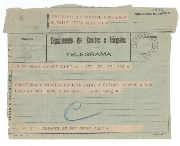 [Telegrama] 1943 ago. 17, Río de Janeiro [a] Gabriela Mistral, Petrópolis [manuscrito] Fedor Ganz.