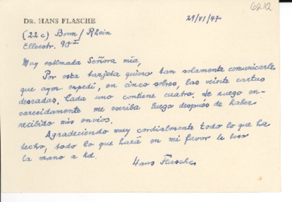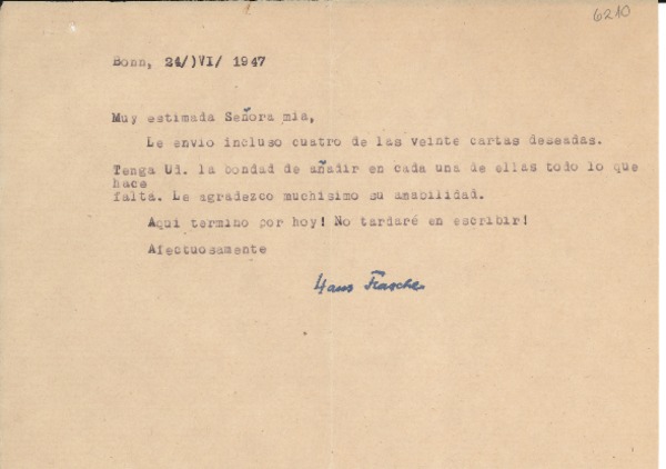 [Tarjeta] 1947 jun. 29, Bonn, [Alemania] [a] [Gabriela Mistral] [manuscrito] Hans Flasche.