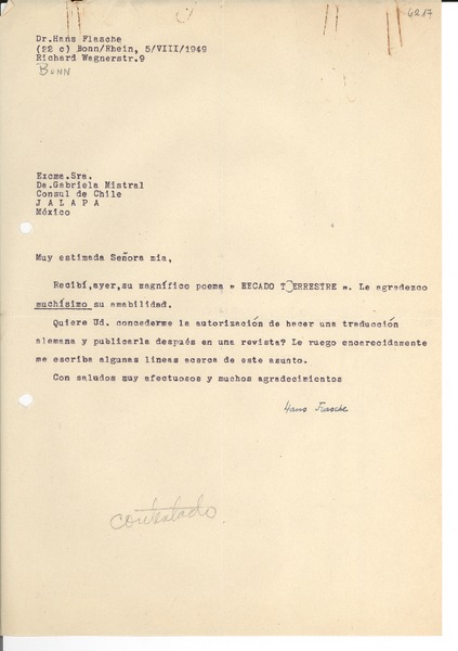 [Carta] 1949 ago. 5, Bonn, [Alemania] [a] Gabriela Mistral, Jalapa, México [manuscrito] Hans Flasche.