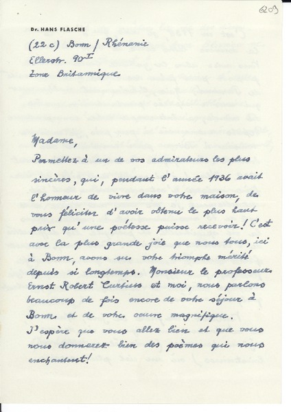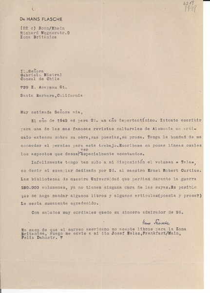 [Carta] [1949], Bonn, [Alemania] [a] Gabriela Mistral, Santa Barbara, California [manuscrito] Hans Flasche.