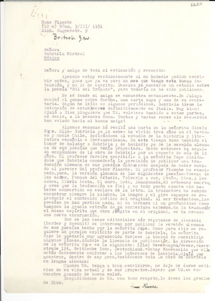 [Carta] 1951 mar. 3, Bonn, [Alemania] [a] Gabriela Mistral, México [manuscrito] Hans Flasche.