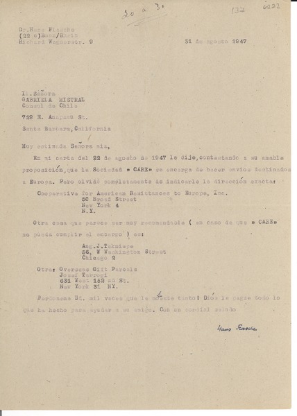 [Carta] 1947 ago. 31, Bonn, [Alemania] [a] Gabriela Mistral, Santa Barbara, California [manuscrito] Hans Flasche.