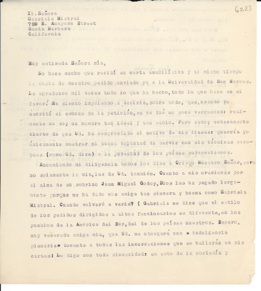 [Carta] [a] [Gabriela Mistral] [manuscrito] De un amigo.
