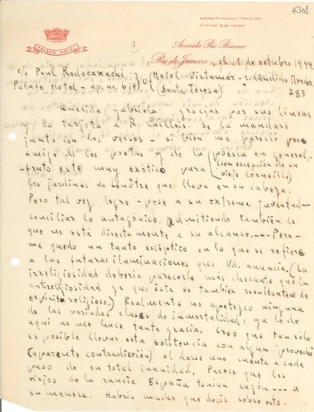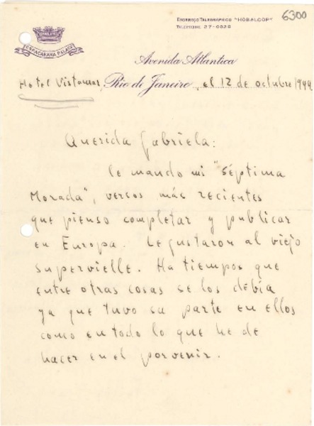 [Carta] 1944 oct. 12, Río de Janeiro [a] Gabriela Mistral [manuscrito] Fedor Ganz.