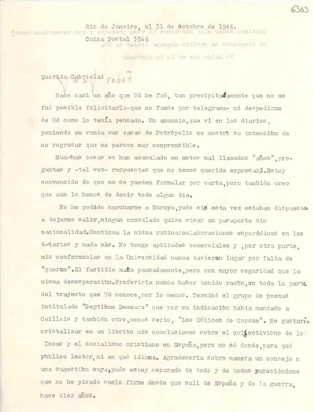 [Carta] 1946 oct. 31, Río de Janeiro [a] Gabriela Mistral [manuscrito] Fedor Ganz.