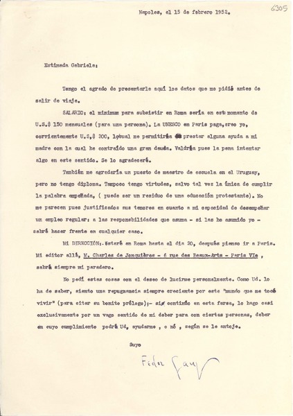 [Carta] 1952 feb. 15, Nápoles [a] Gabriela Mistral [manuscrito] Fedor Ganz.