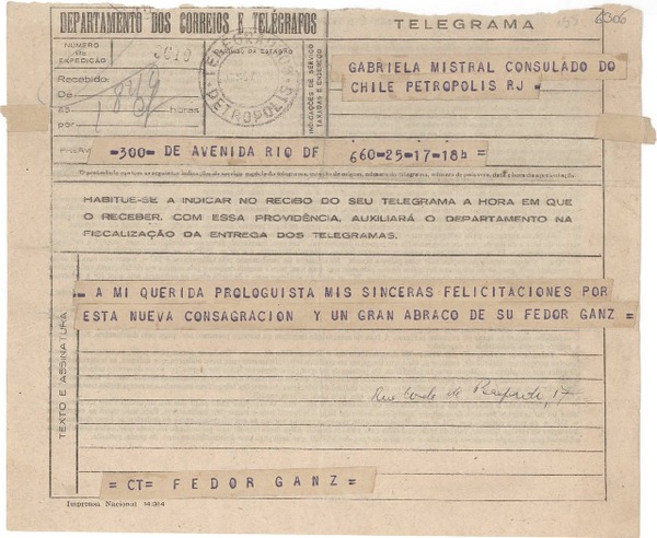 [Telegrama] 1945 nov. 17, Río de Janeiro [a] Gabriela Mistral, Petrópolis [manuscrito] Fedor Ganz.