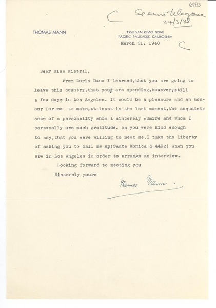 [Carta] 1948 Mar. 21, California, [EE.UU.] [a] [Gabriela] Mistral [manuscrito] Thomas Mann.
