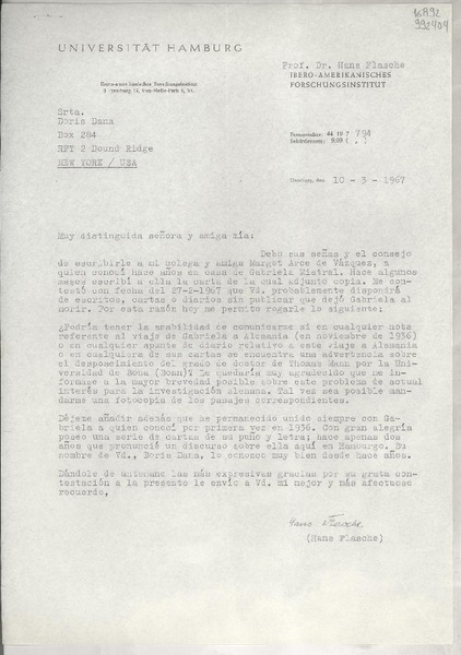 [Carta] 1967 mar. 10, Hamburg, [Alemania] [a] Doris Dana, Box 284, Pound Ridge, New York [manuscrito] Hans Flasche.