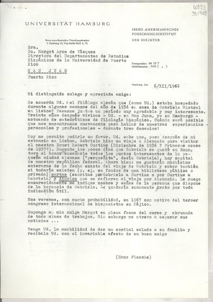 [Carta] 1966 dic. 6, Hamburg, [Alemania] [a] Margot Arce de Vázquez, Directora del Departamento de estudios Hispánicos de la Universidad de Puerto Rico, San Juan, Puerto Rico [manuscrito] Hans Flasche.