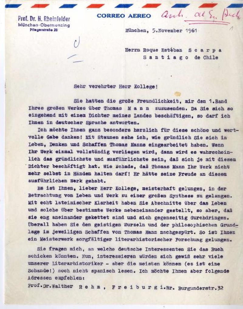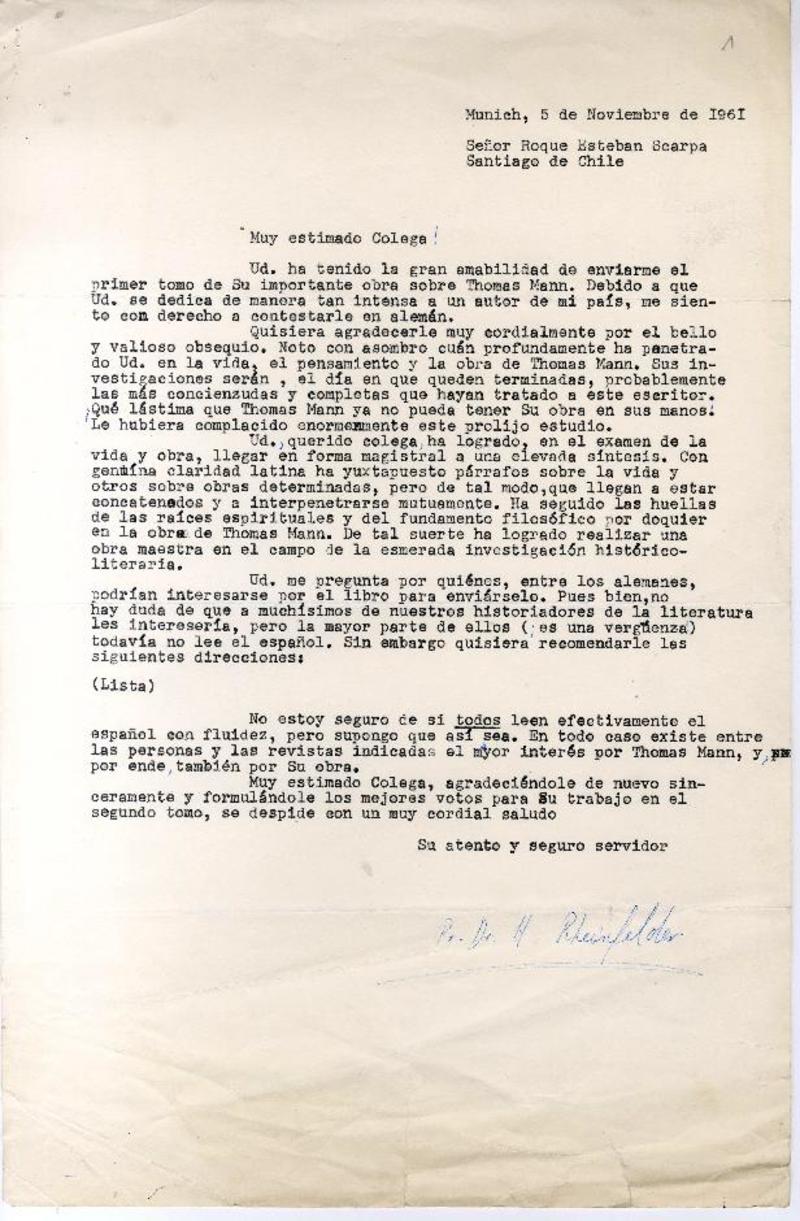 München, Alemania [a] Roque Esteban Scarpa, Chile carta, 1961 noviembre 5, [manuscrito] Hans Rheinfelder.