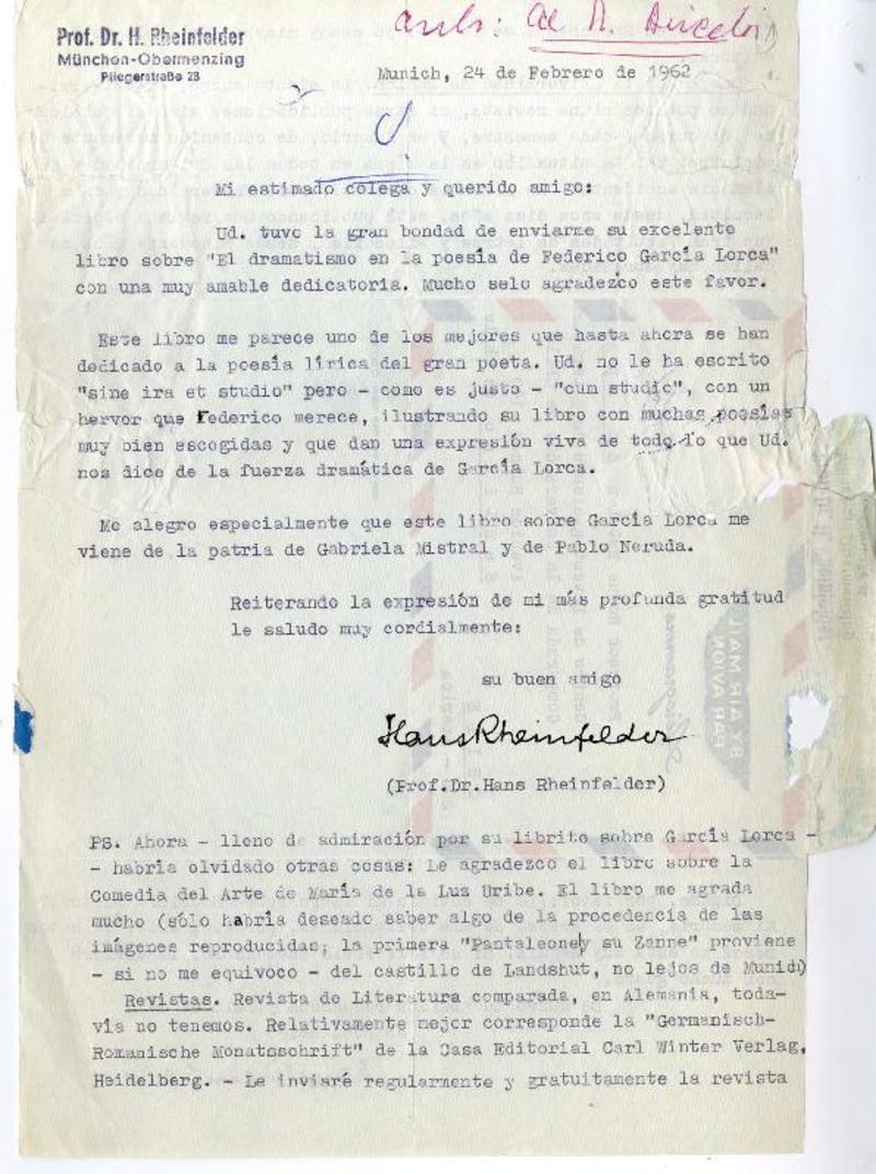 München, Alemania [a] Roque Esteban Scarpa, Chile carta, 1962 febrero 24, [manuscrito] Hans Rheinfelder.