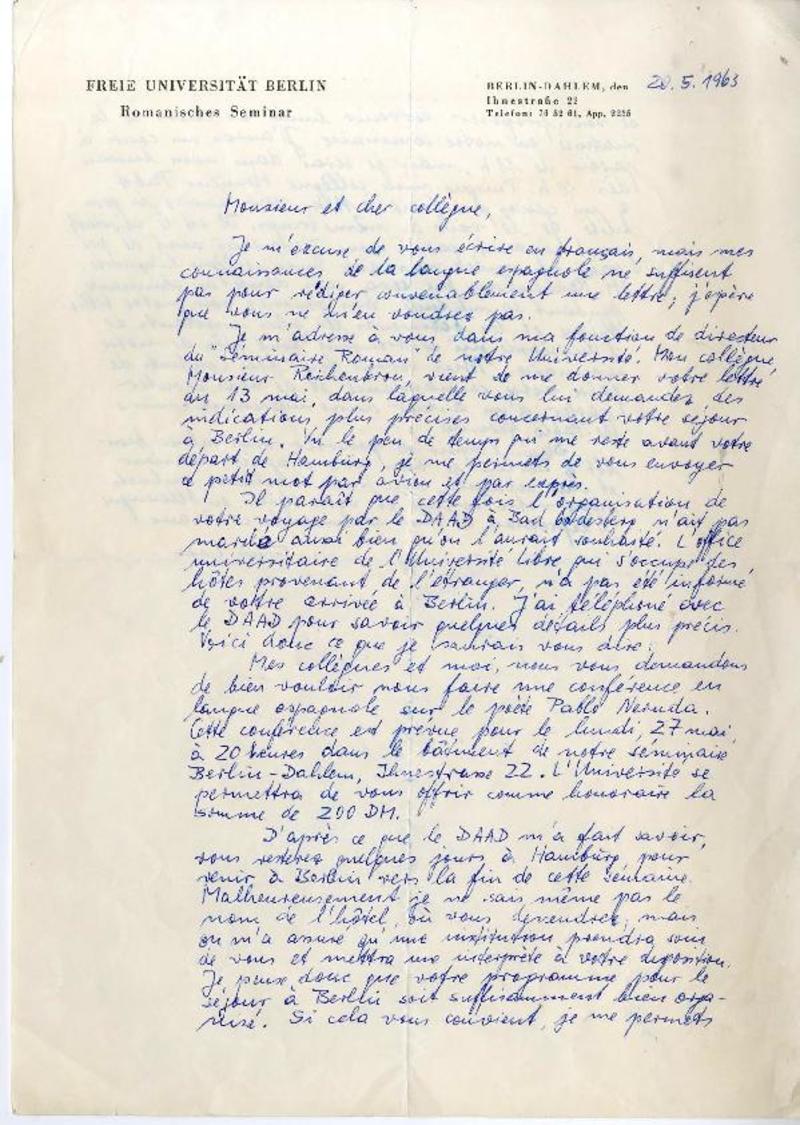 Berlin, Alemania [a] Roque Esteban Scarpa Carta, 1963 mayo 20, [manuscrito]. Erich Loos.