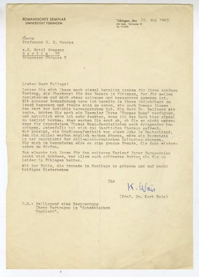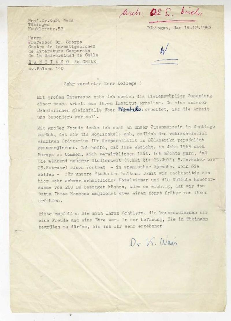 Tübingen, Alemania [a] Roque Esteban Scarpa Carta, 1962 diciembre 14, [manuscrito]. Kurt Wais.