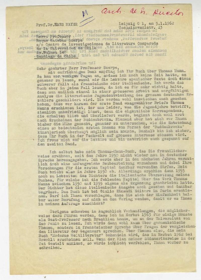 Autores alemanes - Manuscritos alemanes - Mayer, Hans - Correspondencia - Scarpa, Roque Esteban - Autores chilenos