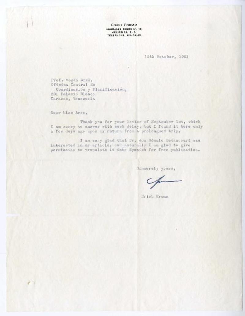 México, D.F. [a] Magda Arce, Caracas, Venezuela Carta, 1961 octubre 12, [manuscrito] Erich Fromm.