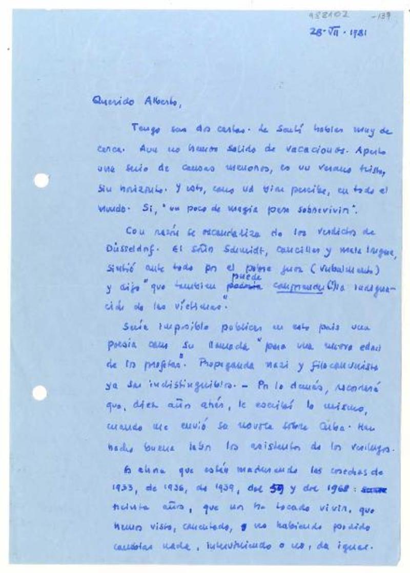 [Berlin, Alemania] [a] Alberto Baeza Flores Carta, 1981 julio 28, [manuscrito] Erwin Walter Palm.