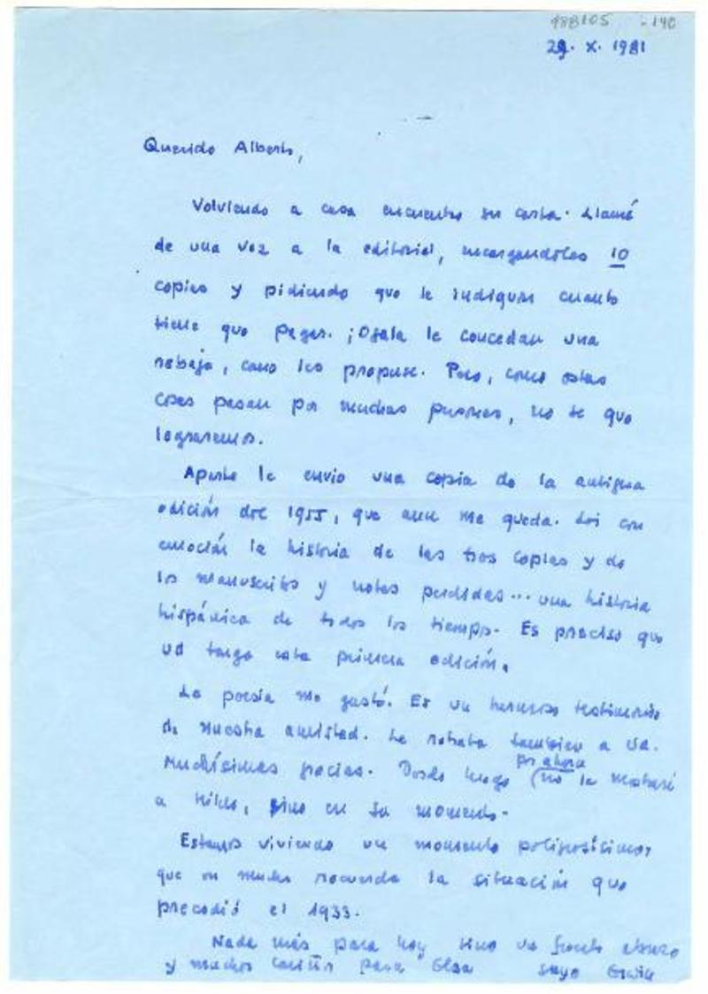 [Berlin, Alemania] [a] Alberto Baeza Flores Carta, 1981 octubre 29, [manuscrito] Erwin Walter Palm.