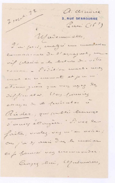 [Carta] 1932 oct. 7, París, Francia [a] Magdalena Petit [manuscrito] Alexandre Arnoux.