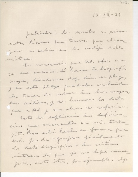[Carta] [19]39 dic. 13, [Chile?] [a] Gabriela [Mistral] [manuscrito] Magdalena Petit.