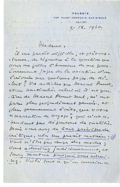 [Carta] 1930 septiembre 9, Allier, Francia [a] Magdalena Petit [manuscrito] Valéry Larbaud.