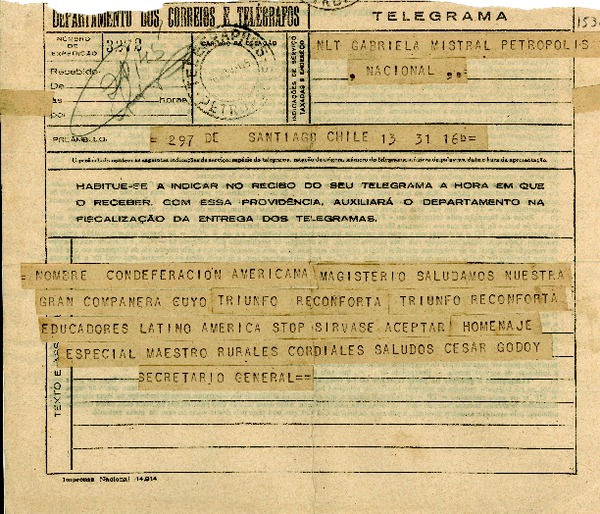 [Telegrama] 1945 nov. 16, Santiago [a] Gabriela Mistral, Petrópolis [manuscrito] César Godoy.