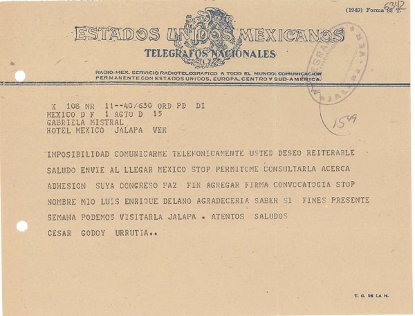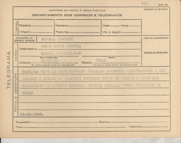 [Telegrama] 1945 nov. 21, [Brasil] [a] César Godoy Urrutia, Santiago, Chile [manuscrito] Gabriela Mistral.