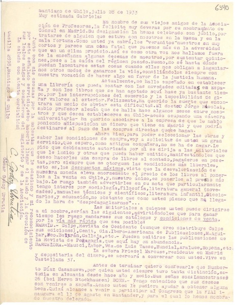 [Carta] 1933 jul. 28, Santiago de Chile [a] Gabriela Mistral [manuscrito] César Godoy Urrutia.