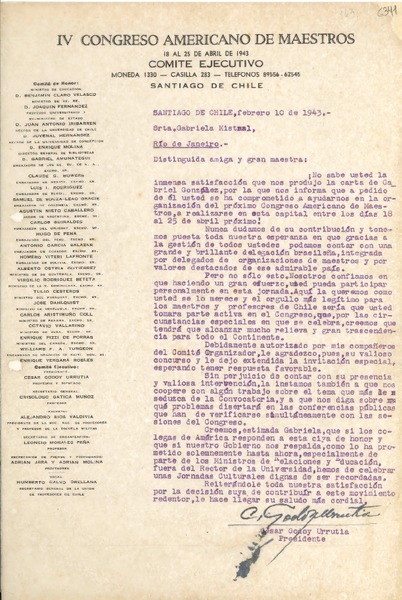 [Carta] 1943 feb. 10, Santiago de Chile [a] Gabriela Mistral, Río de Janeiro [manuscrito] César Godoy Urrutia.