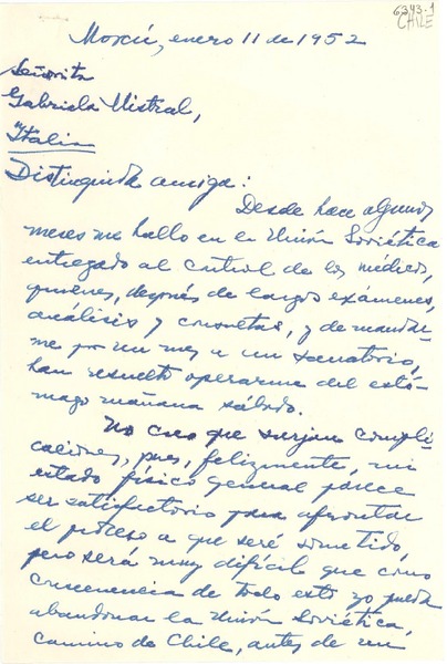 [Carta] 1952 ene. 11, Moscú [a] Gabriela Mistral, Italia [manuscrito] César Godoy Urrutia.
