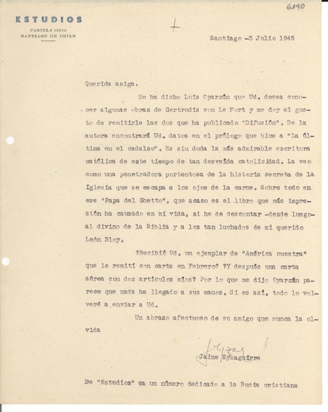 [Carta] 1945 jul. 3, Santiago, Chile [a] [Gabriela Mistral] [manuscrito] Jaime Eyzaguirre.