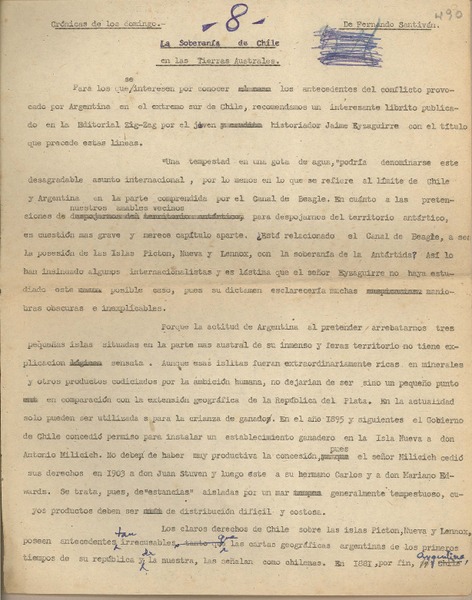 La soberanía de Chile en las tierras australes [manuscrito] Fernando Santiván.