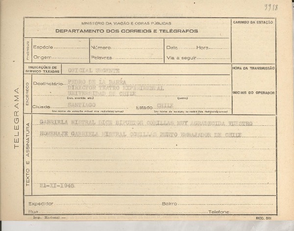 [Telegrama] 1945 nov. 17, Santiago, Chile [a] Gabriela Mistral, Embajada Chile, Rio, [Brasil] [manuscrito] Pedro de la Barra.
