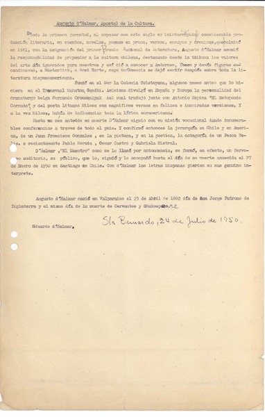 Augusto D'Halmar : apóstol de la cultura [manuscrito] / Eduardo D'Halmar.