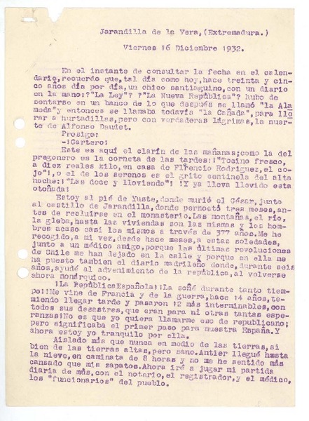 [Carta] 1932 dic. 16, Jarandilla de la Vera, Extremadura, España [a] Salvador Reyes [manuscrito] Augusto D'Halmar.