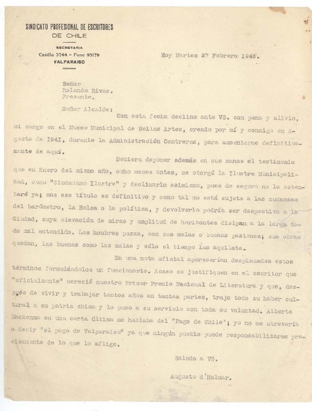 [Carta] 1945 feb. 27, Valparaíso, Chile [a] Rolando Rivas [manuscrito] Augusto D'Halmar.
