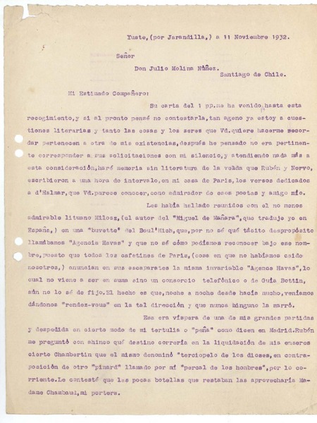 [Carta] 1932 nov. 11, Yuste, Jarandilla, España [a] Julio Molina Nuñez [manuscrito] Augusto D'Halmar.