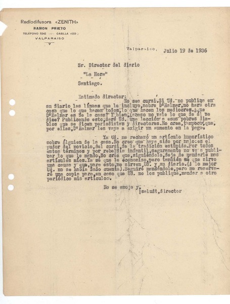 [Carta] 1936 jul. 19, Valparaíso, Chile [a] Director del diario "La Hora" [manuscrito]