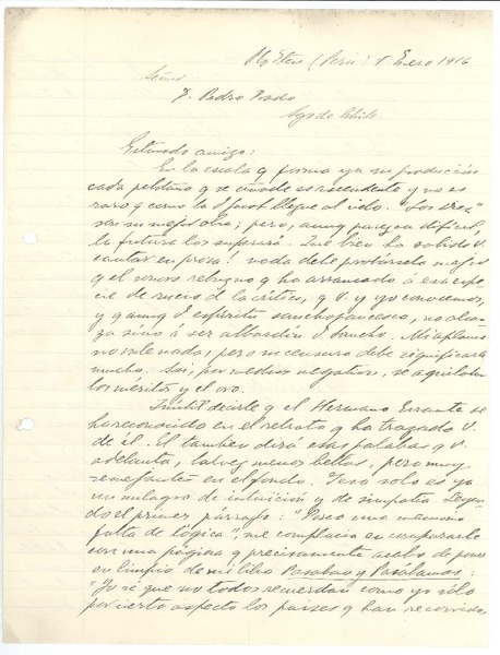 [Carta] 1916 ene. 15, Eten, Perú [a] Pedro Prado [manuscrito] Augusto D'Halmar.