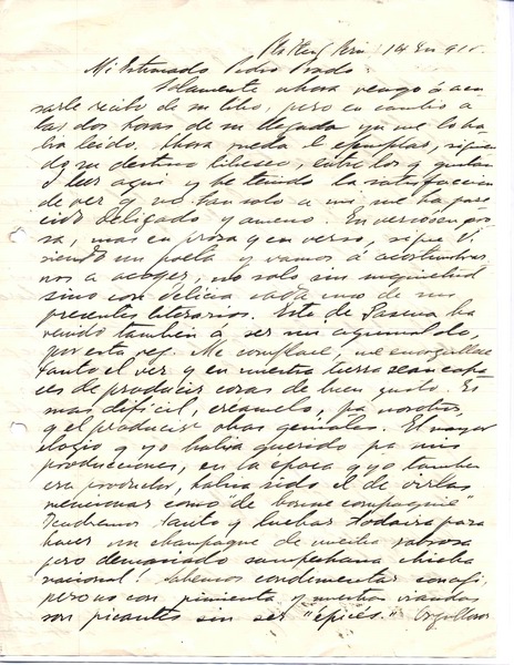 [Carta] 1915 ene. 14, Eten, Perú [a] Pedro Prado [manuscrito] Augusto D'Halmar.
