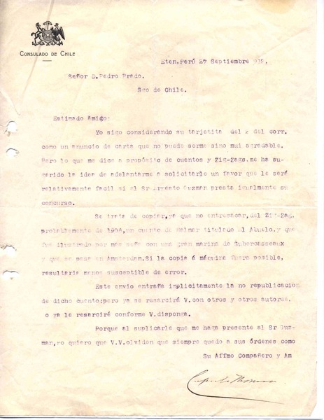 [Carta] 1912 sep. 27, Eten, Perú [a] Pedro Prado [manuscrito] Augusto Thompson.